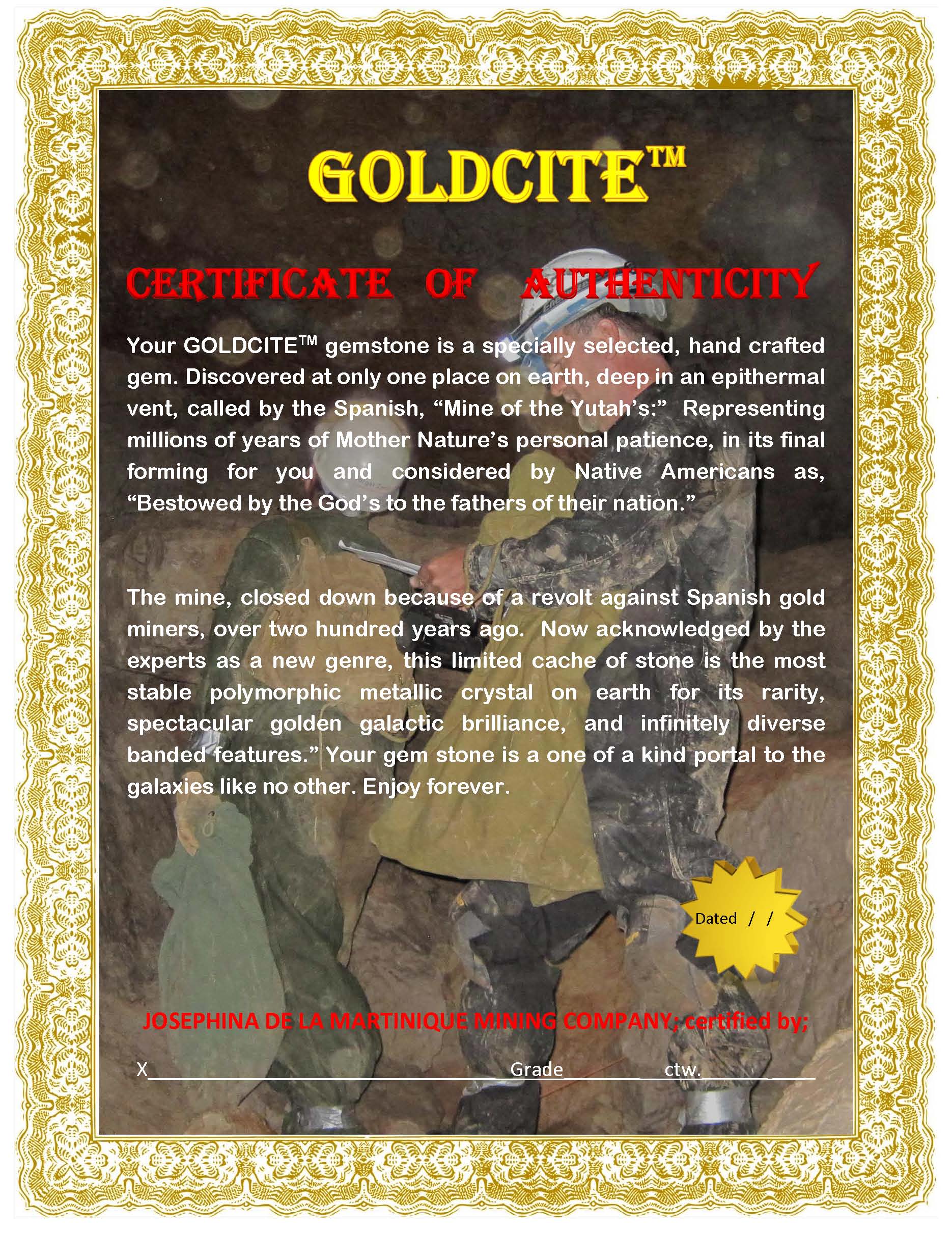 Each Goldcite gem stone qualifies for a "Certificate of Authenticity" when purchased. Certification will include Grade, carat weight, mine Representatives signature and date. Without this certificate the stone is not a Goldcite gem stone.